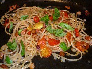 Whole Wheat Spaghetti with Roasted Tomatoes, Bacon and Thyme Breadcrumbs Recipe