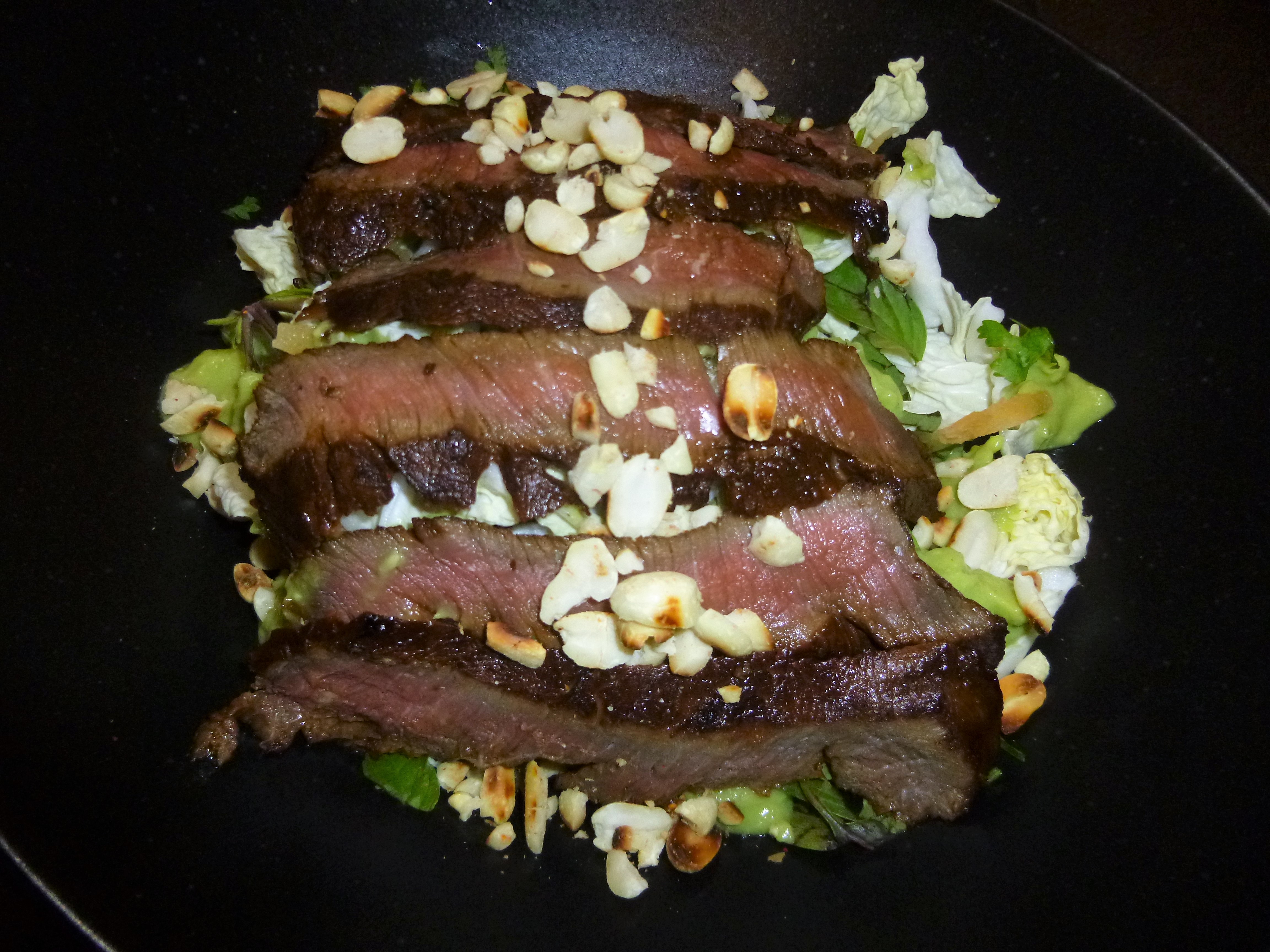 Marinated Flank Steak on a bed of Napa Cabbage with an Avocado and Wasabi Dressing Recipe