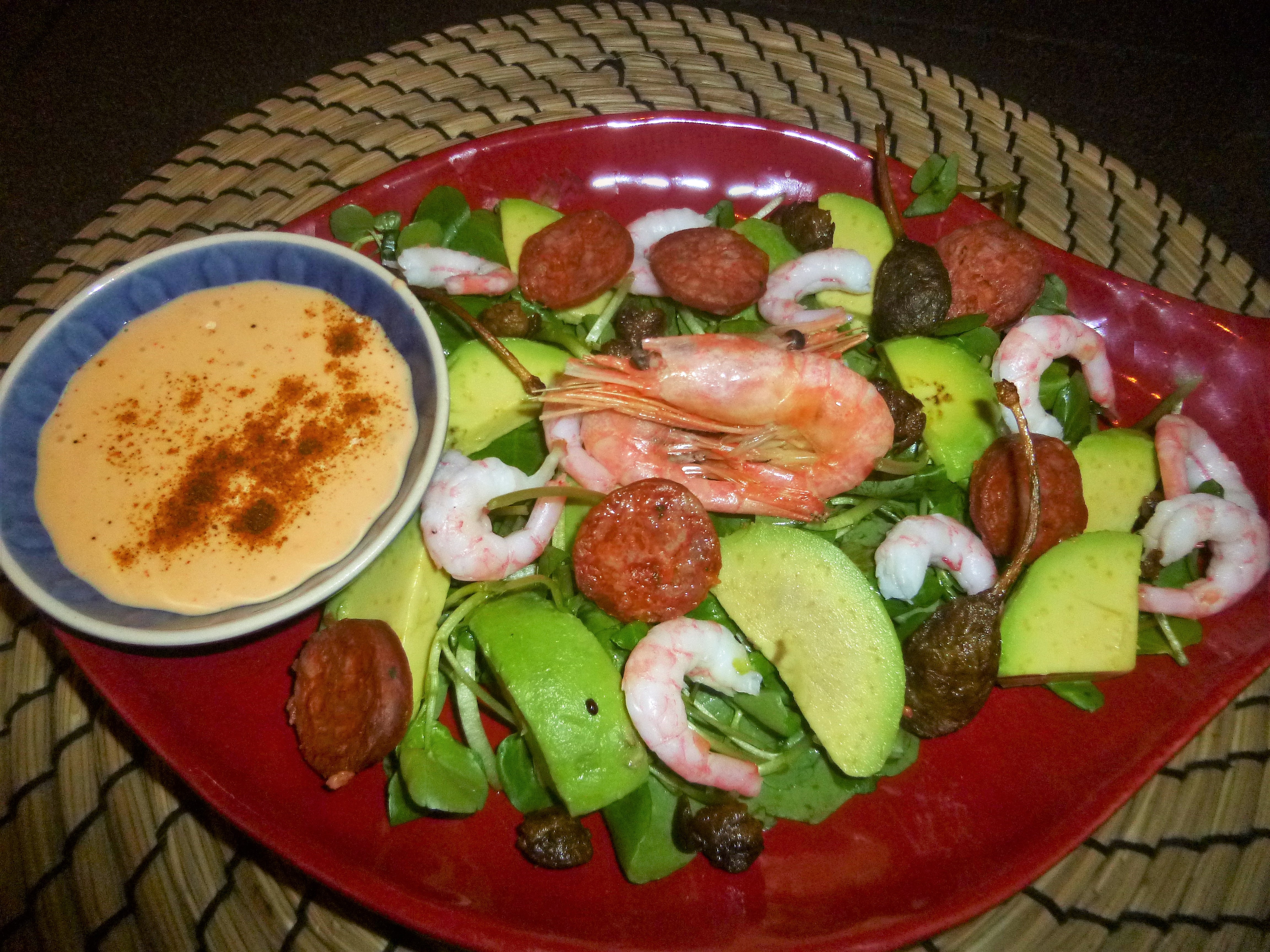 Prawn, Chorizo and Avocado Salad with Crispy Capers and Eggless Lime and Chilli Mayo