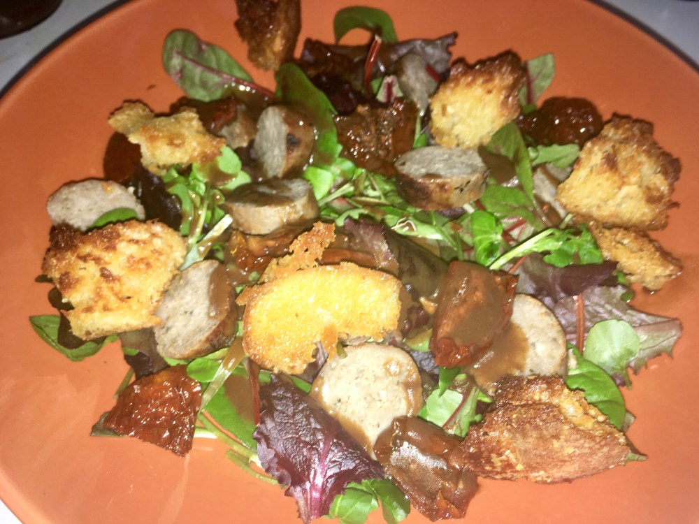 So we had a couple of sausages leftover from dinner one night and a stub of sourdough so I thought I would make a salad. It worked really well and had a really comforting flavour. The crunch from the croutons really finish off. It kind of tastes like a deconstructed breakfast. I really loved the brown sauce dressing.