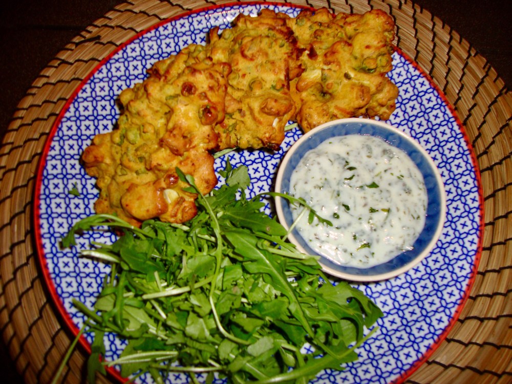 - To serve, place a handful of salad leaves on 2 serving plates. Spoon the yoghurt mix into 2 small dishes and serve alongside the salad and pakoras. Enjoy š