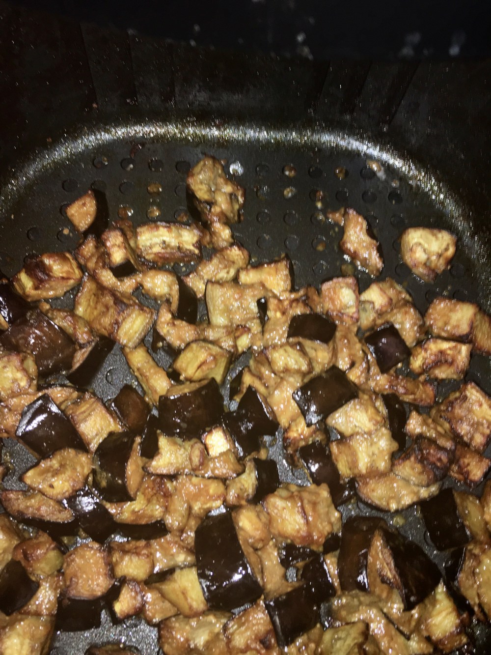 - Pre heat air fryer or oven to 190 degrees (fan). Put the aubergine in a bowl with 2 tbsp of oil, season and mix so all the pieces are coated. Spread out and Cook for 20 mins until slightly soft. Put the rest of the ingredients into a bowl. Coat the cooked aubergine in the miso mixture and bake for a further 10 mins until golden and caramelised. Set aside.