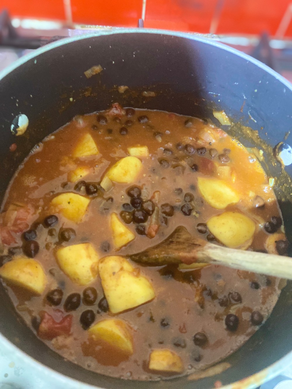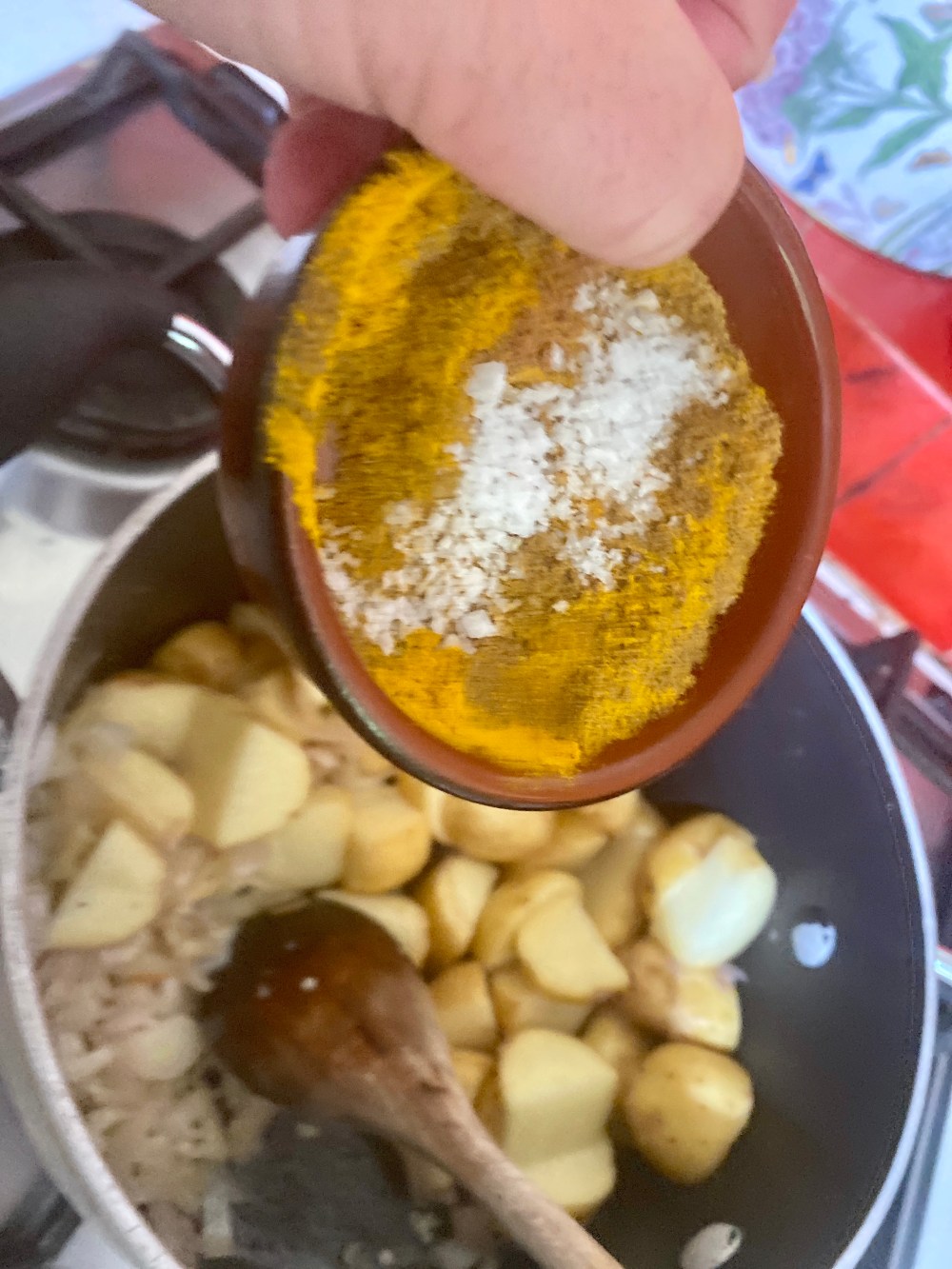- Add the potatoes and spices, stir to coat and cook out for a minute