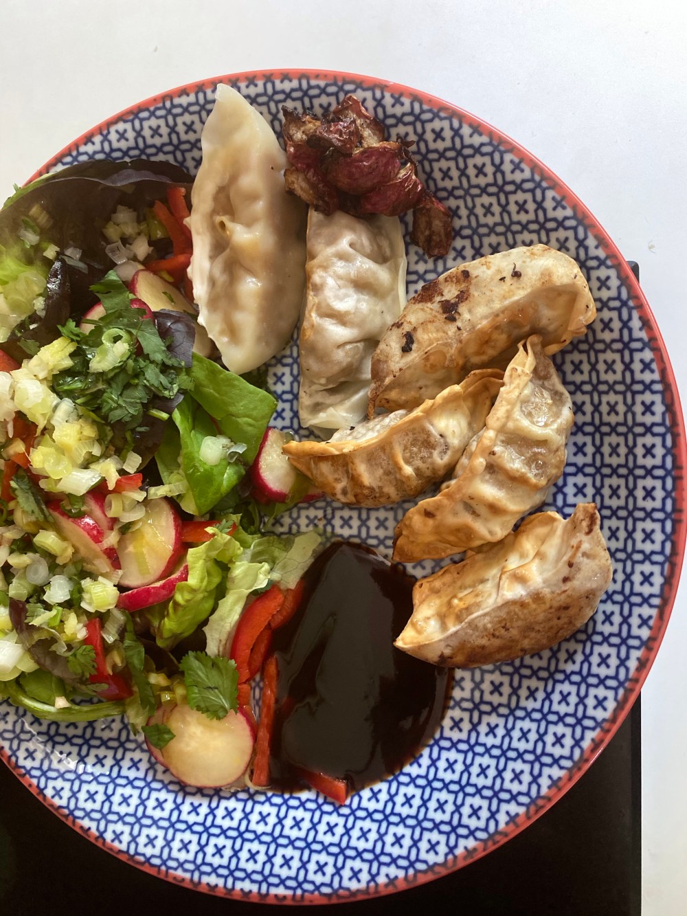 I bought some gyoza from Lidl and thought I might try them in a salad. I steamed half and air fried the rest. The result was I appreciated the crispy ones more. The radish and pepper worked so well and I’ve made this sizzling dressing before it’s so mice as it makes the flavours not so strong as the oil cooks the finely chopped vegetables. I also added a squirt of hoisin sauce to do my gyoza in. Yummy yum yum ๐