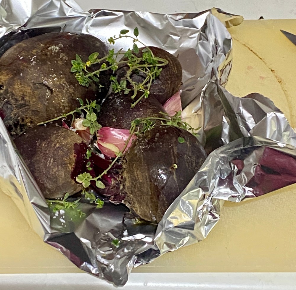 - Preheat oven to 200 degrees fan. Cut the tops of the beetroot, place in a sheet of file. Add the garlic, thyme, olive oil and seasoning, give it a good rub seal the foil and bake for 30-40 minutes or until tender.
