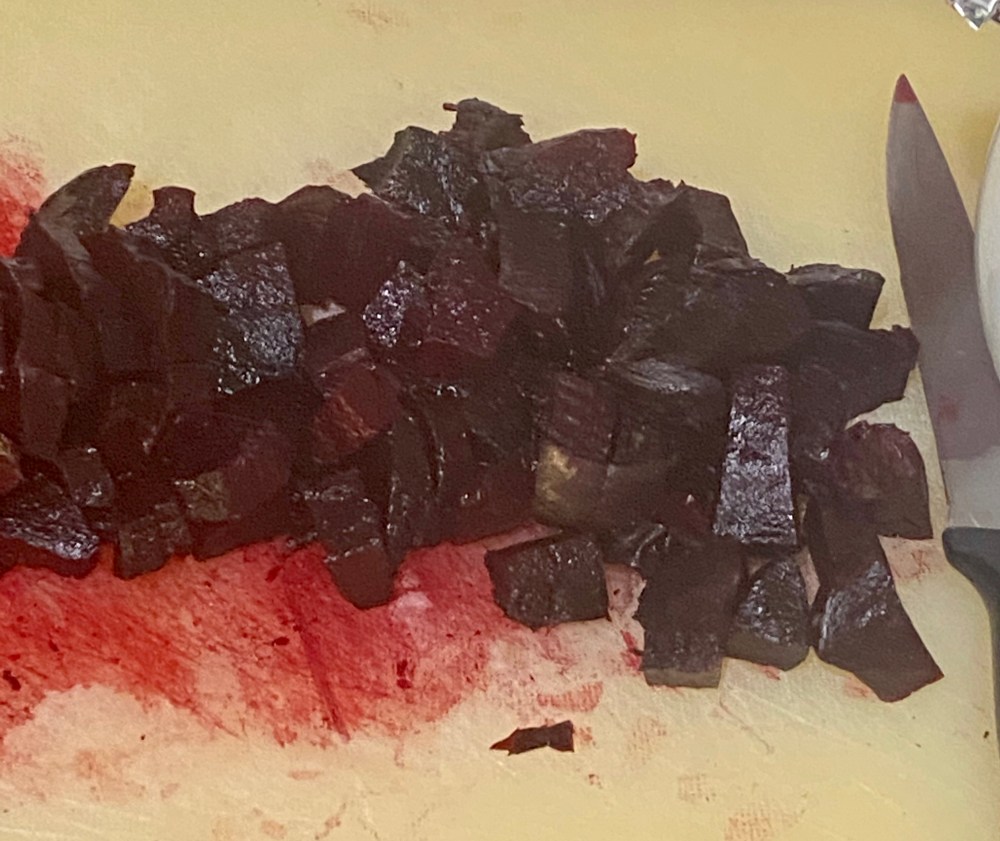 - Once cooked and cooled, peel off the skins and roughly chop.