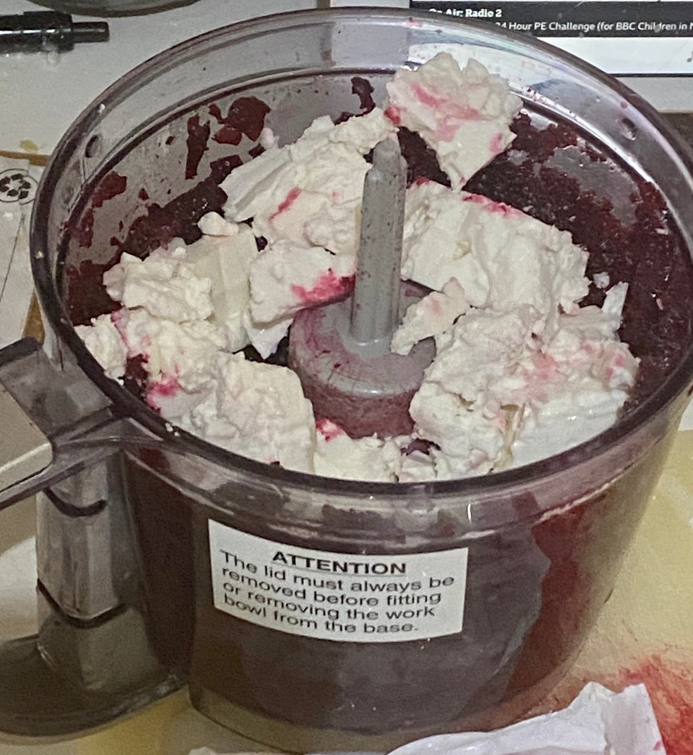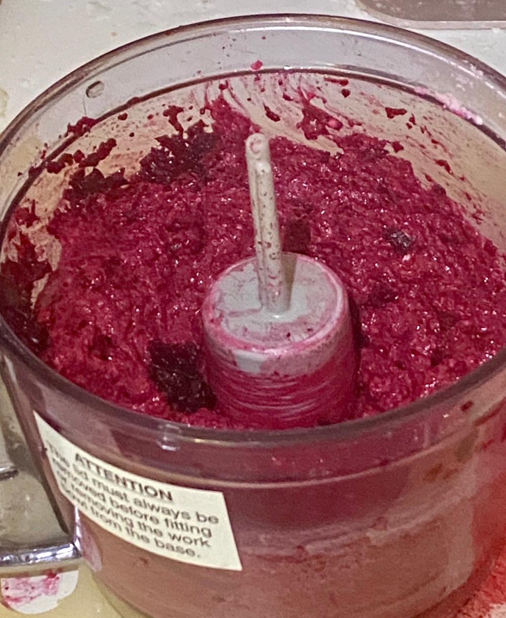 - Place the chopped beetroot into a food processor, crumble in the feta. Blitz until you have a paste. Serve with bread or crackers. Enjoy 🙂