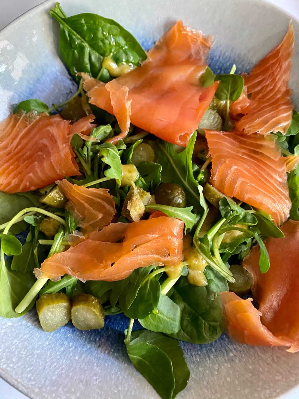 I love this time of year as all the cured fish and meats are available and there are usually offers too. I love smoked trout as it is more delicate than salmon. Gherkins and smoked fish go so well together and you get a lovely sweetness from the honey mustard.