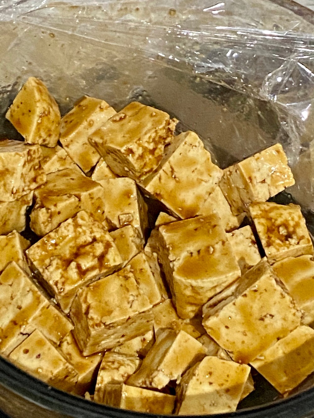 - Add the tofu in a bowl with the soy sauce stir lightly to coat, cover and refrigerate for at least 30 minutes or overnight if you can.