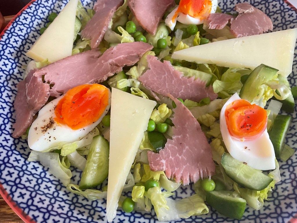 Being british I love a good ploughman’s with a dollop of piccalilli or pickle. To cut down the calories I thought I would try it as a salad oh my word it is delicious I love the added crunch from the lettuce and cucumbers and the sweetness from the peas. The cheese added a welcome creaminess the ham added saltiness and to top it all off you have crunchy croutons and a delicious sweet and sour dressing. I think this would be a crowd pleaser as it’s familiar flavours but lighter and a bit different.