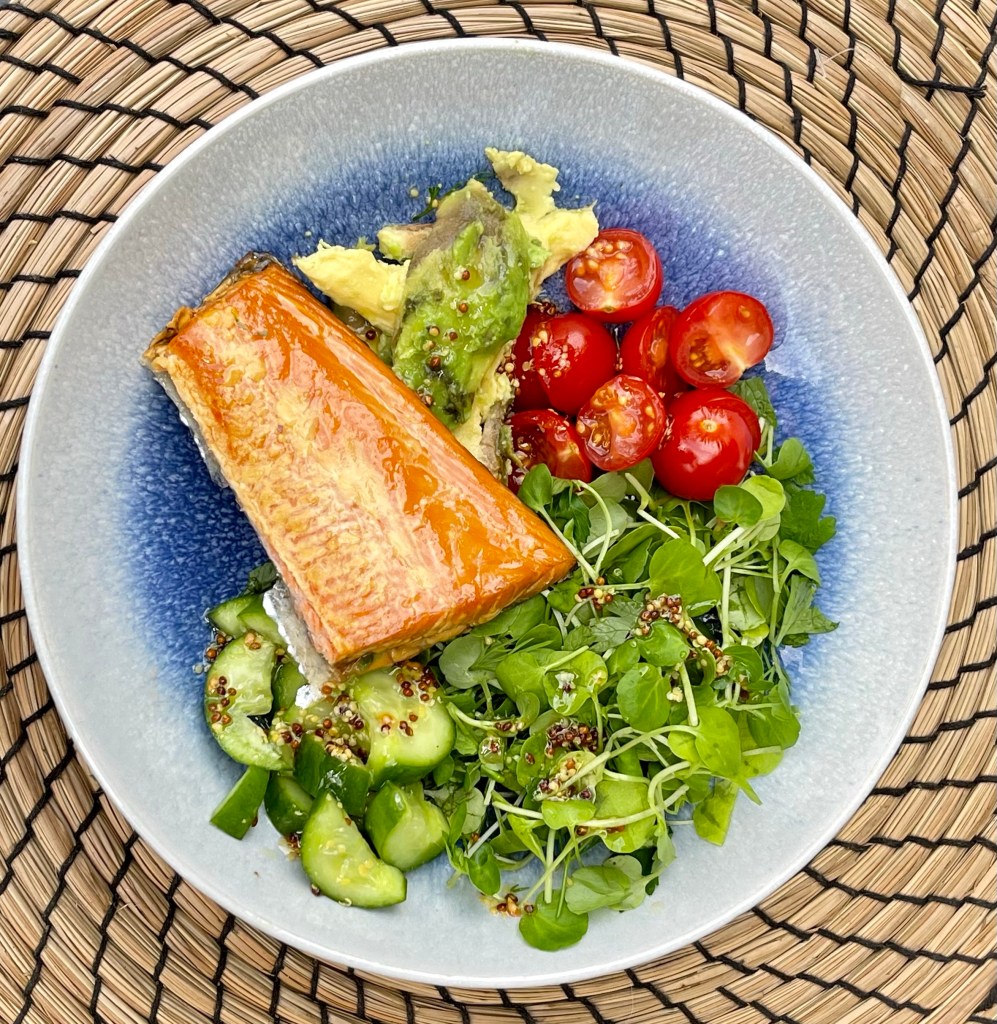 - To serve, drizzle the dressing over the salad and place the salmon on top. Enjoy 😊