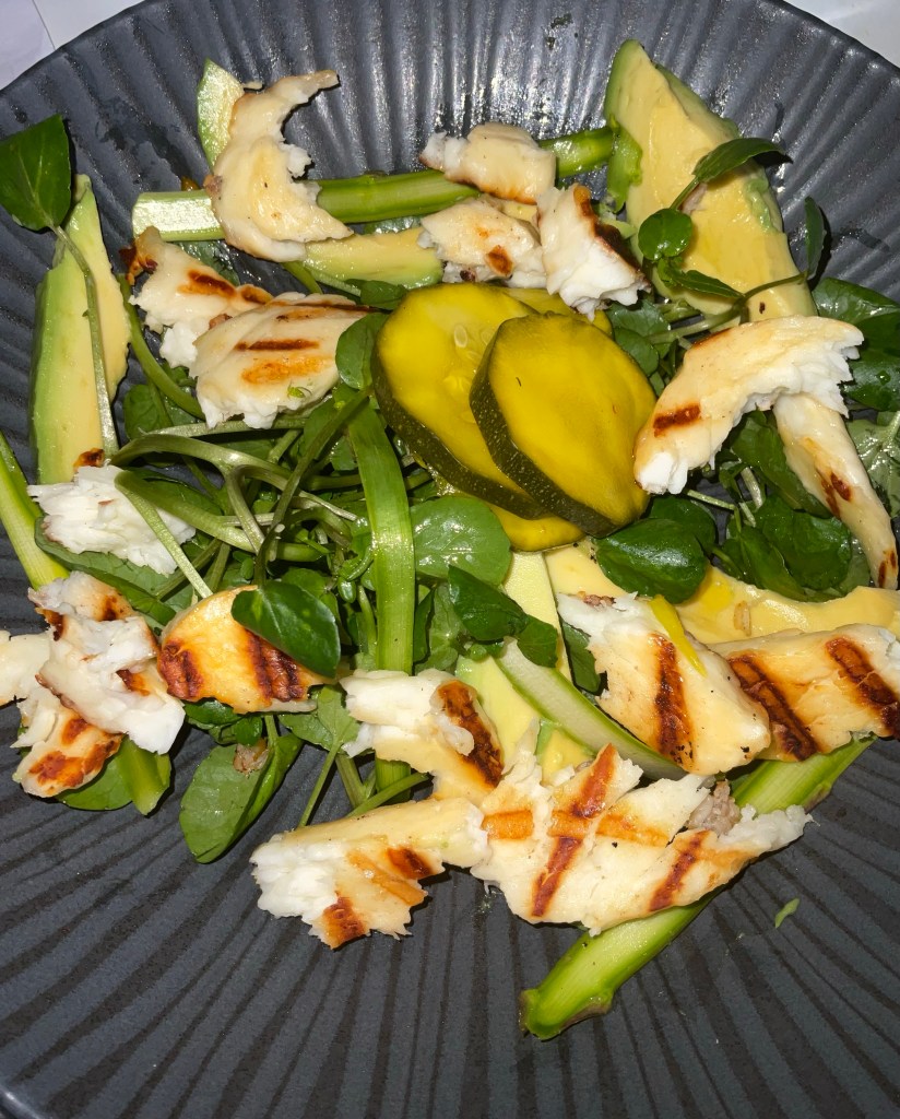 - Scatter over the dill pickles and tear the halloumi around the plate. Enjoy 😊