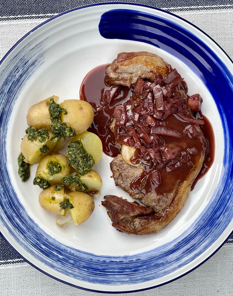 Sorry another recipe using wild garlic pesto 🙈 you can use any pesto in this dish. I love lamb chops when they are cooked right the are so juicy and tender and I love the crispy fat too. I was getting board of red wine gravy on them all the time so shook it up a bit with this recipe. It was soooo yummy all the flavours worked perfectly the tender lamb, sweet and sour gravy and of course creamy herby mash.