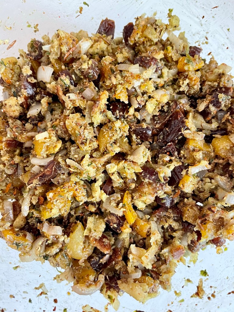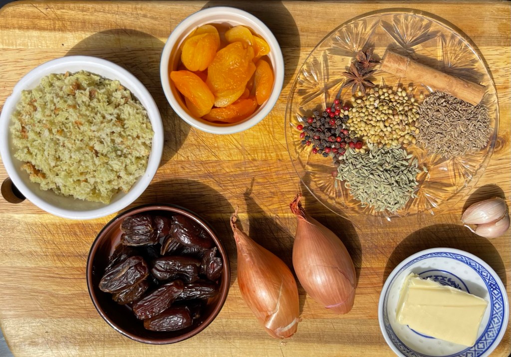 - Start by frying the shallots in a drizzle of oil until translucent. Tip into a bowl and add the breadcrumbs, dates, apricots, garlic and rosemary. In a dry pan add the fennel, cumin, coriander, peppercorns, cinnamon stick and star anise and toast until fragrant about 3 minutes. Place the toasted spices into a spice or coffee grinder and grind until it’s a powder. Add to the bowl with the breadcrumbs and fruit. In a pan add the butter and melt, once melted tip into the stuffing and give it a good mix.