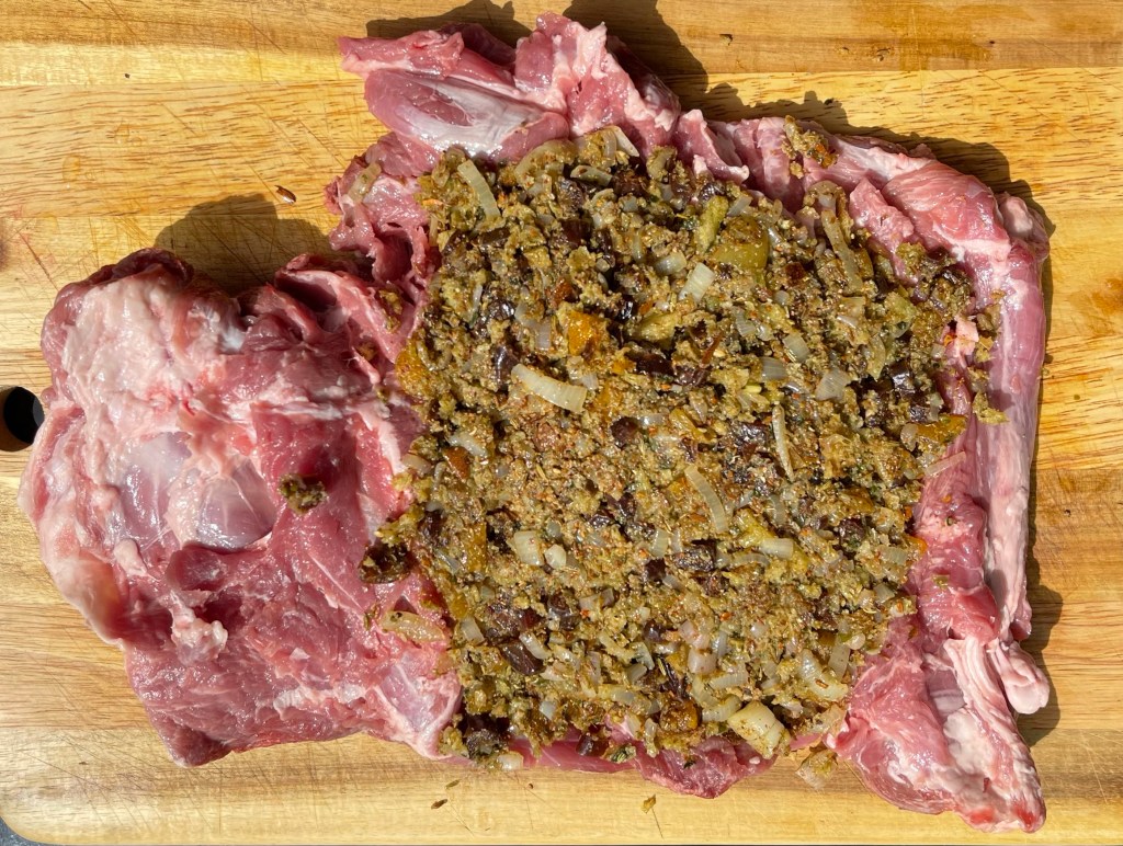 - Unroll the lamb and push the stuffing into the center. Re roll and tie with string.