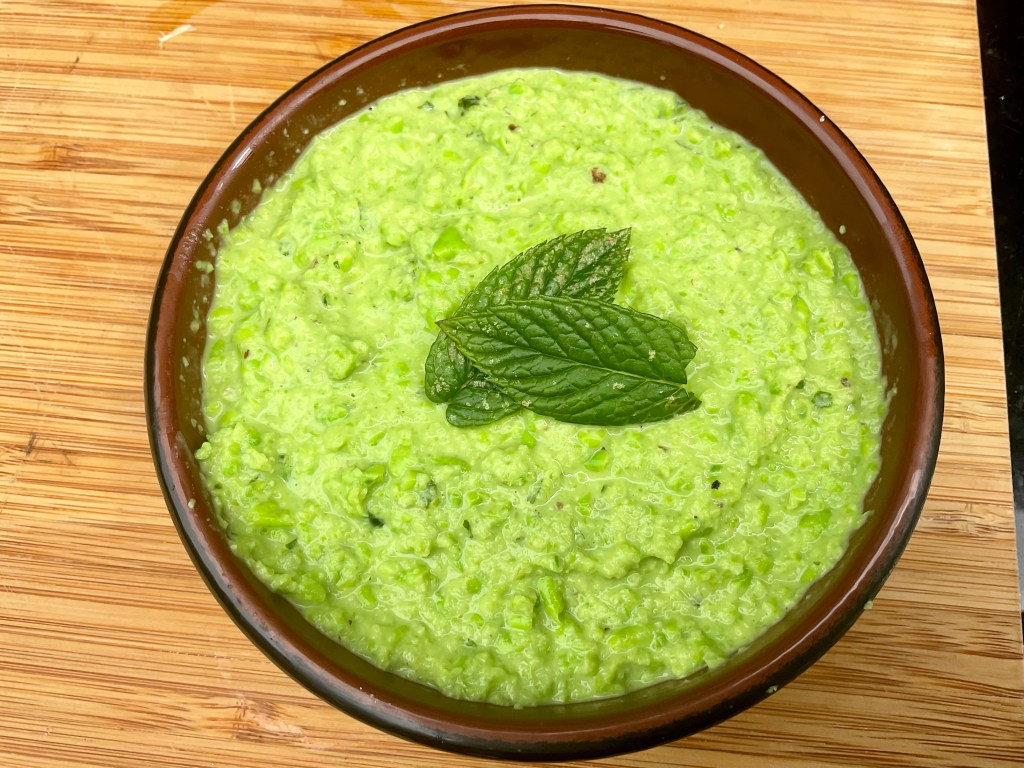 What else screams british summer apart from Pimms? Peas and mint! I made some black pudding Bon Bon’s (recipe to follow) and needed a really light dip to go with them. I didn’t have much in the kitchen but I did have peas in the freezer and mint in the garden. This was so easy I didn’t even defrost the peas I just put them in a colander and ran the hot tap over them. This literally takes a couple of minutes you just chuck everything in the food processor and blitz. The colour is beautiful. If you have people coming over and you are going to have chips and dips to start try this it lightens up any table and is something a bit different. I love how sweet peas are and of course that lovely fresh mint. This is defo a recipe to keep in your back pocket.