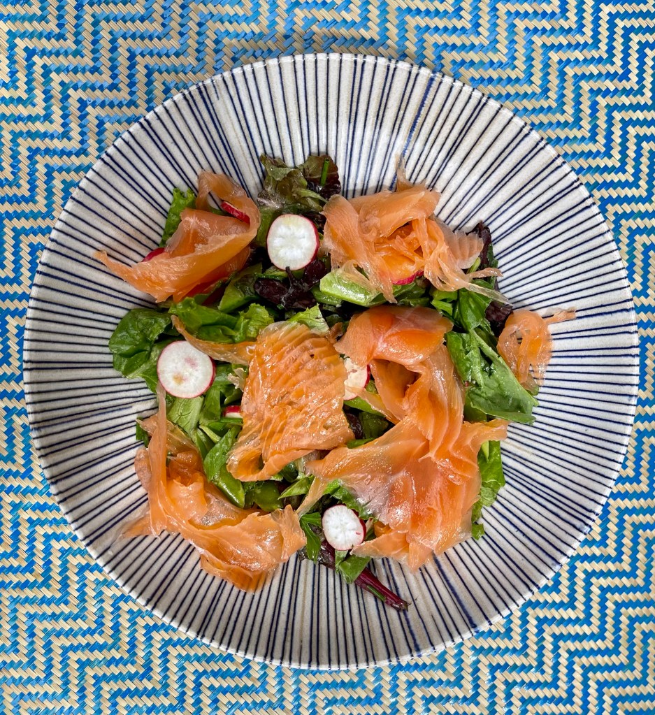 It’s so hot at the moment that sometimes you fancy something light and refreshing. This works perfectly as you have the different textures. Soft smoked salmon, crunchy and sweet sugar snap peas and peppery radish. It’s bright healthy and delicious.