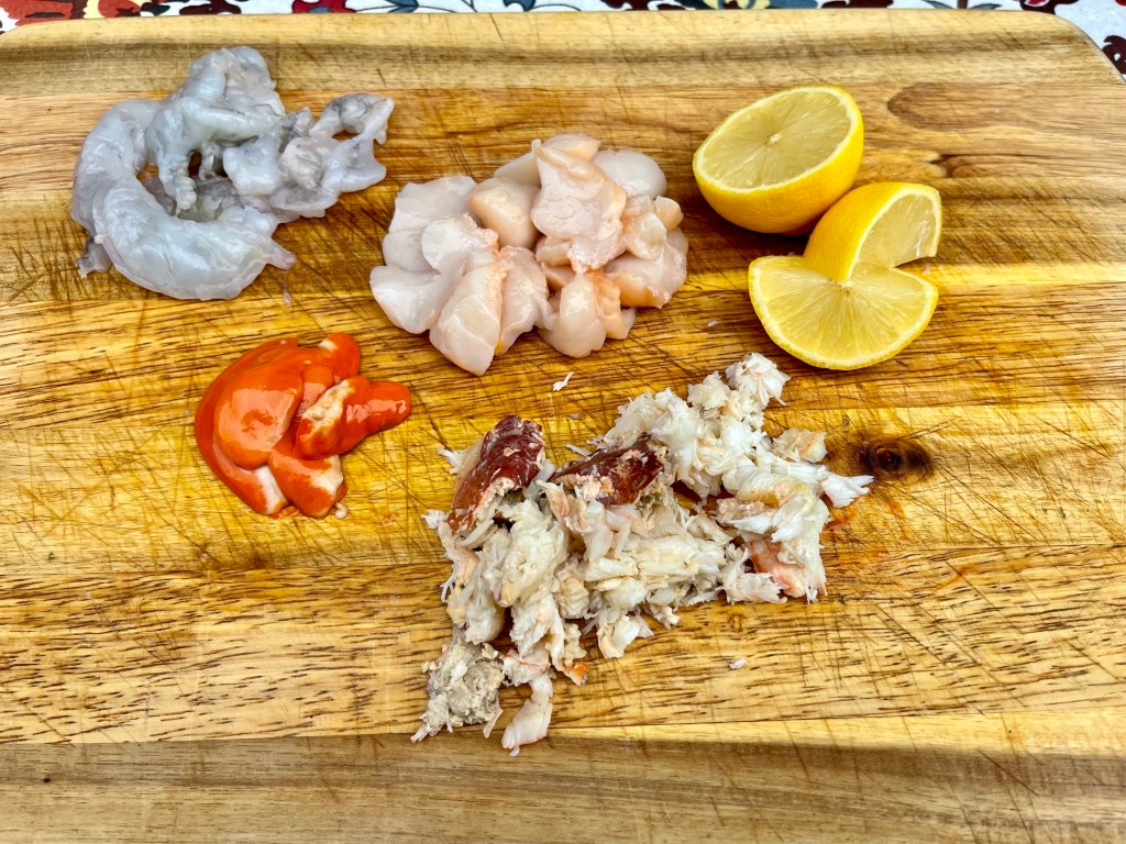 - Spoon over the white sauce evenly. Add the white crab meat, scallops, prawns and capers.