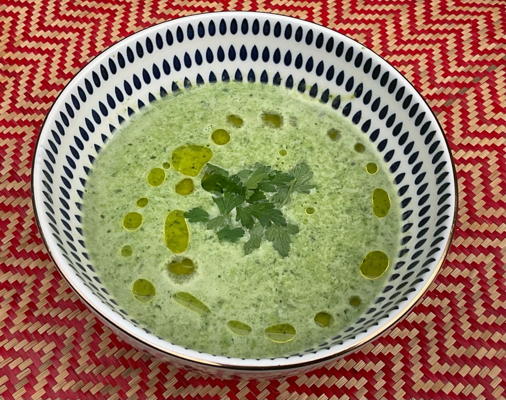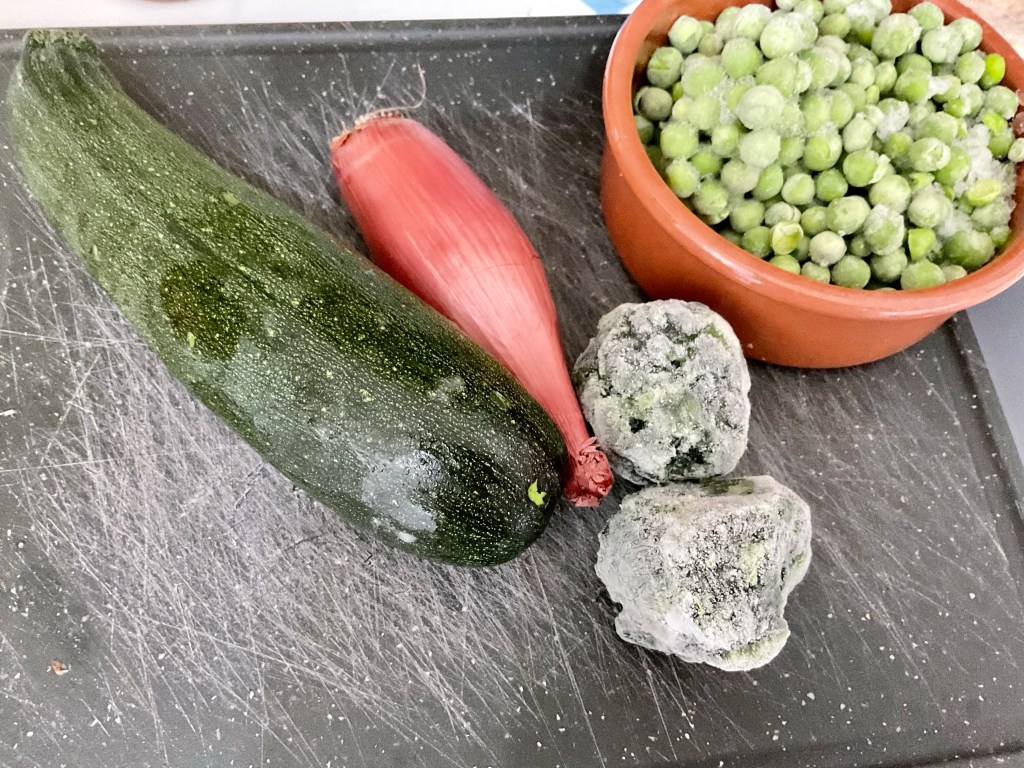 So I had a lonely courgette in the fridge and the temperature is getting cooler now so I decided to go for soup as I always have frozen spinach and peas so decided to chuck them in with the courgette. This was fresh and very quick to make and of course Uber healthy.