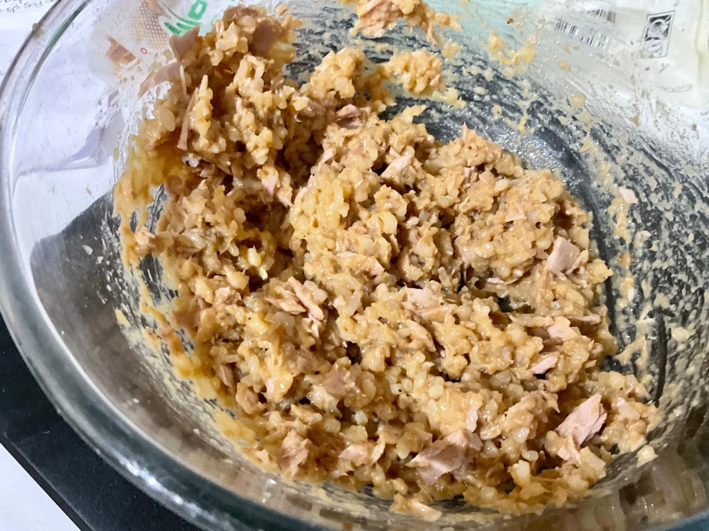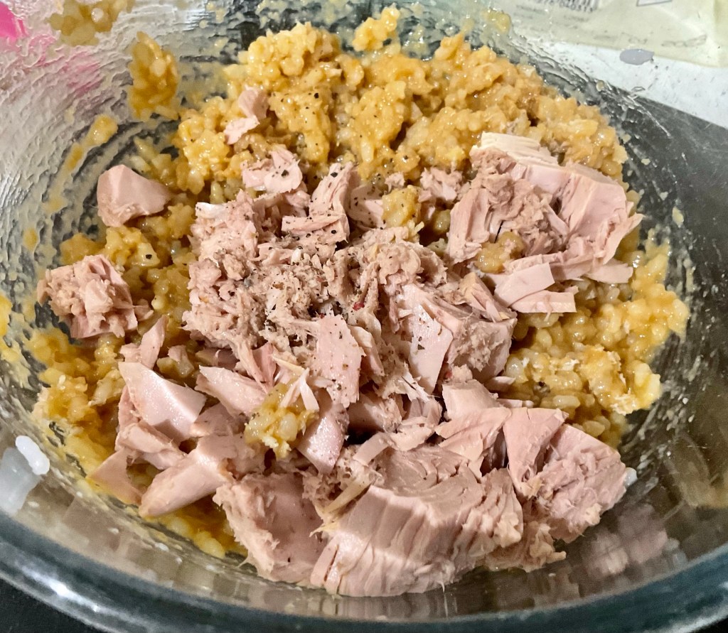 - Add all of the ingredients apart from the tuna, pepper and oil spray. Give it a good mix to combine.