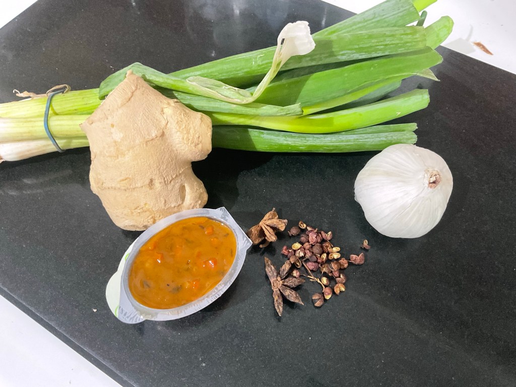 - Add all of the ingredients apart from the spring onion greens and matchsticks of ginger into a saucepan that has a lid.