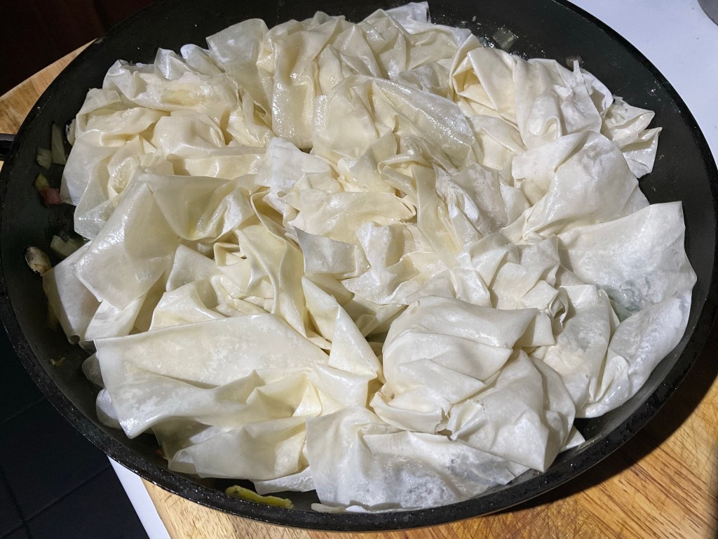 - Lay out a sheet of filo pastry and using a pastry brush, brush a thin layer of the melted butter. Crumple the pastry in your hand and place on top of the slightly cooled filling mixture. Repeat with the rest of the sheets so the filling is covered.