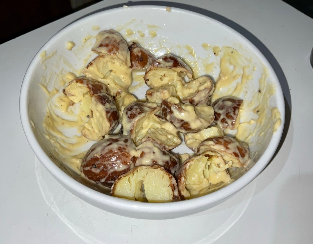 I hate wasting food so I wanted to use up my Sunday roast leftovers. I’ve only ever put leftover new potatoes in a salad but I thought why not roast potatoes. I’m not keen on them cold so zapping them in the microwave for a minute worked perfectly making it a nice warm salad. The zingy horseradish and mustard was really yummy as you don’t want flavours too similar to your roast dinner. A great Monday or Tuesday lunch.