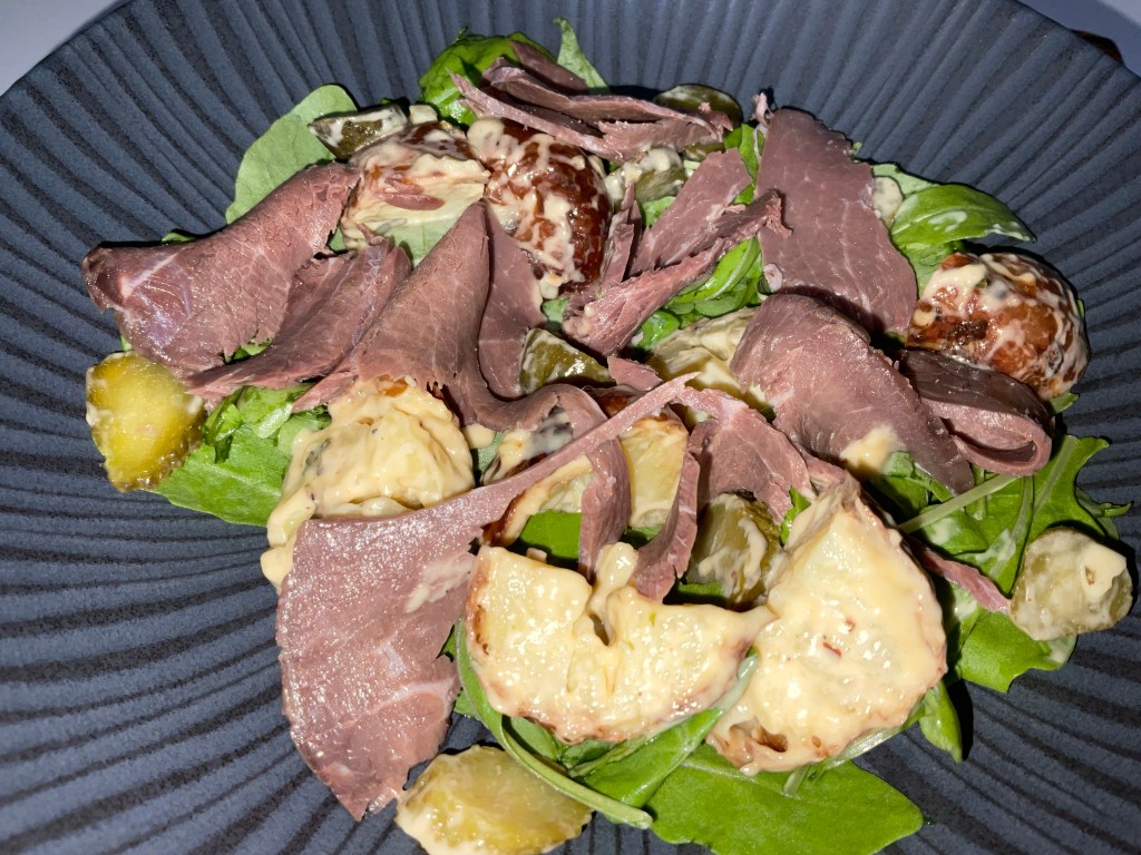 - Spoon the potato mixture over the salad leaves and finish by tearing over the beef.