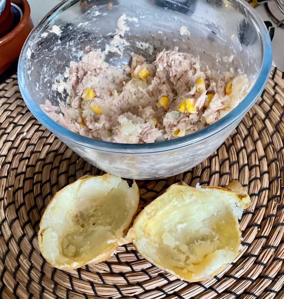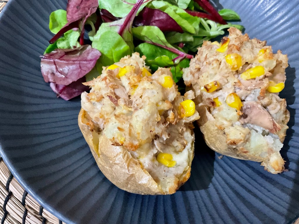 I love jacket potato as you can literally put anything on them. I love a certain brand of baked beans with cheese on top. (If they are good enough for our queen consort Camilla, they are good enough for me 😉) My hubby Paulie doesn’t like beans so I had to try something else. Tuna, Sweetcorn, Mayo and cheese was a no brainier for me. I really like scooping out the potato and mix it with the filling and pop it back in, re bake so you get crispy skins and crispy bits on the topping.