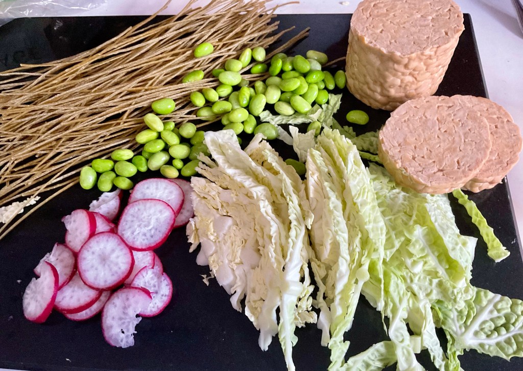 - Add the cooked noodles, edamame beans, radish, cabbage and cooked tempeh between 2 bowls. Sprinkle over the peanuts and drizzle over the dressing. Enjoy 😊