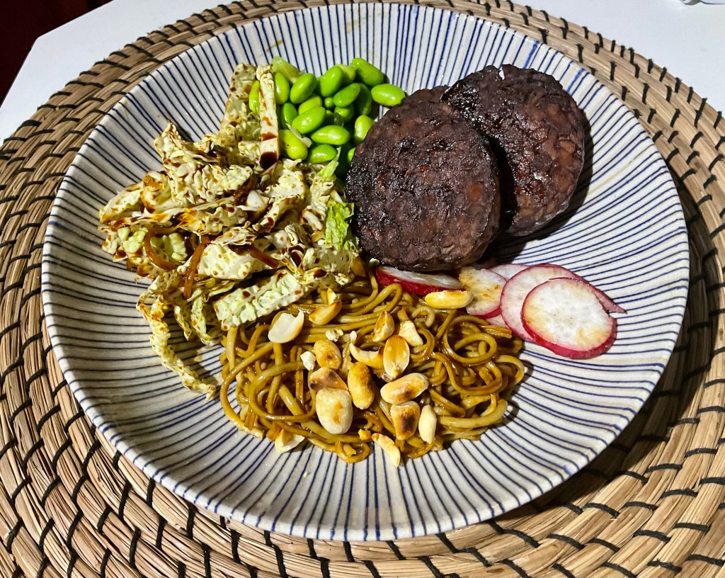 It’s time for some tempeh again. I went down the Asian route again as I love it so much as the tempeh really soaks up the yummy flavours. Next time I’m going to go down a different route I think. I always keep a bag of edamame beans in the freezer and just rinse them to defrost them so I can chuck them in any salad. I love Chinese duck and pancakes so I tend to add hoisin sauce to as many things as possible, like this recipe. In the Chinese supermarket I came across these unusual noodles that is the brand of the celebrity chef Ching He Huang. They were delicious and the texture was really good so if you see any different noodles give them try.