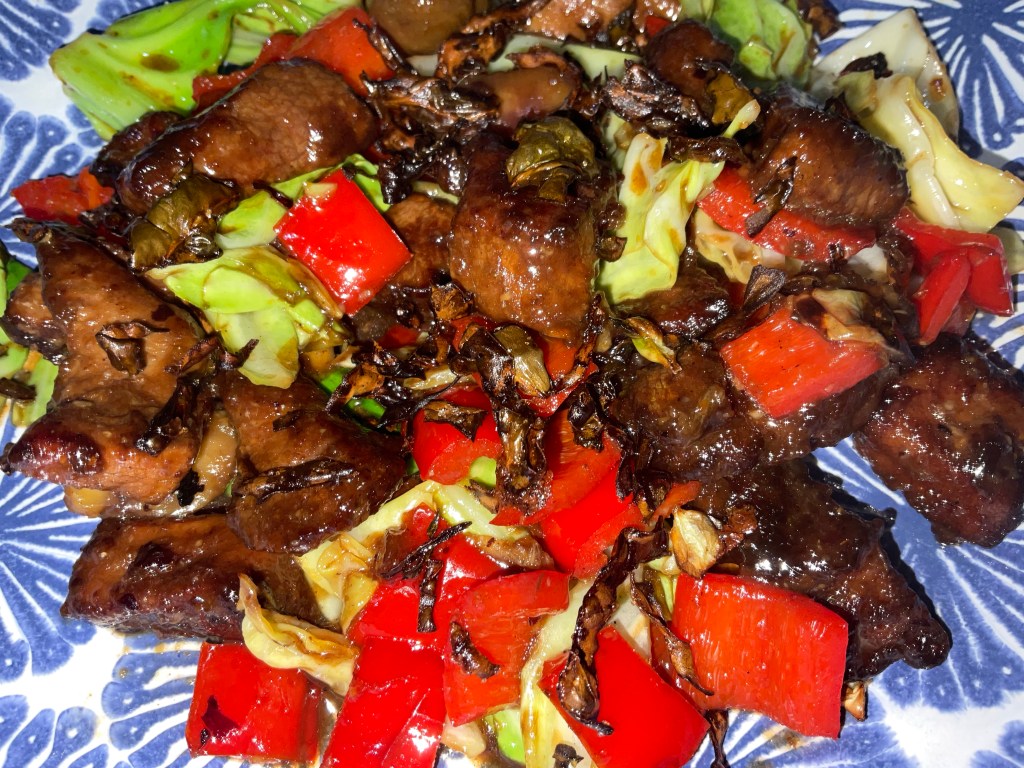 - In a wok or frying pan, add the oil until it starts to smoke. Add the duck breast and stir fry for 3 minutes moving it around so it’s browned all over. Remove and set aside.