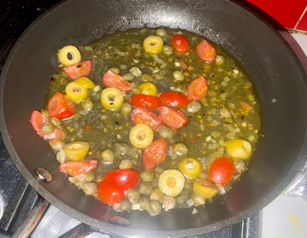 Marinated Sea Bass Fillets with a Tomato, Olive and Caper Sauce