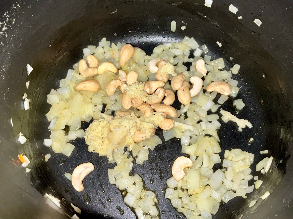 - Add the ginger and cashew nuts cook for a minute. Add the garlic and cook for another 30 seconds.