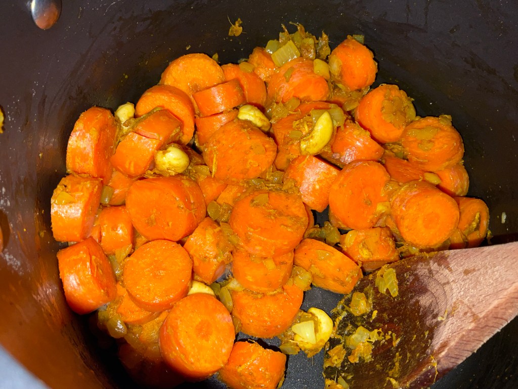 - Add in the cumin and tumeric. Give it a good stir so everything is coated. Add in the carrots and again stir so the carrots get coated too.