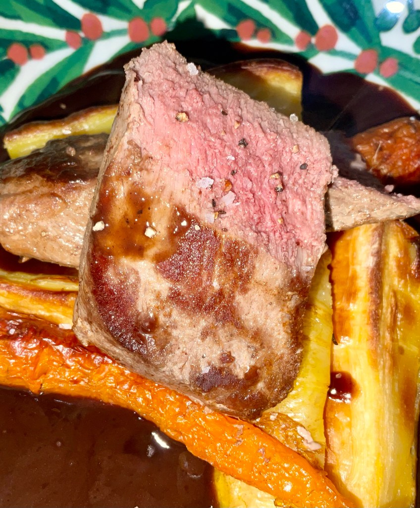 This was a treat. I didn’t get into game until later on in life, but I love it now. Venison is my favourite and this has a much deeper flavour than fillet steak though I do love that too. To make it really comforting and wintery I served it with roasted vegetables and a rich warming thick juniper gravy, they are like a fruity peppercorns in taste and work perfectly with venison.