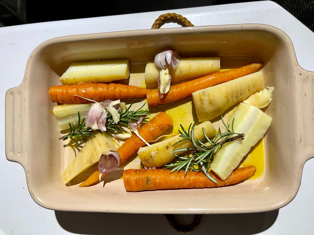 - Remove from oven, add the rest of the ingredients and roast for about 45 minutes turning the veg halfway through. Enjoy 😊
