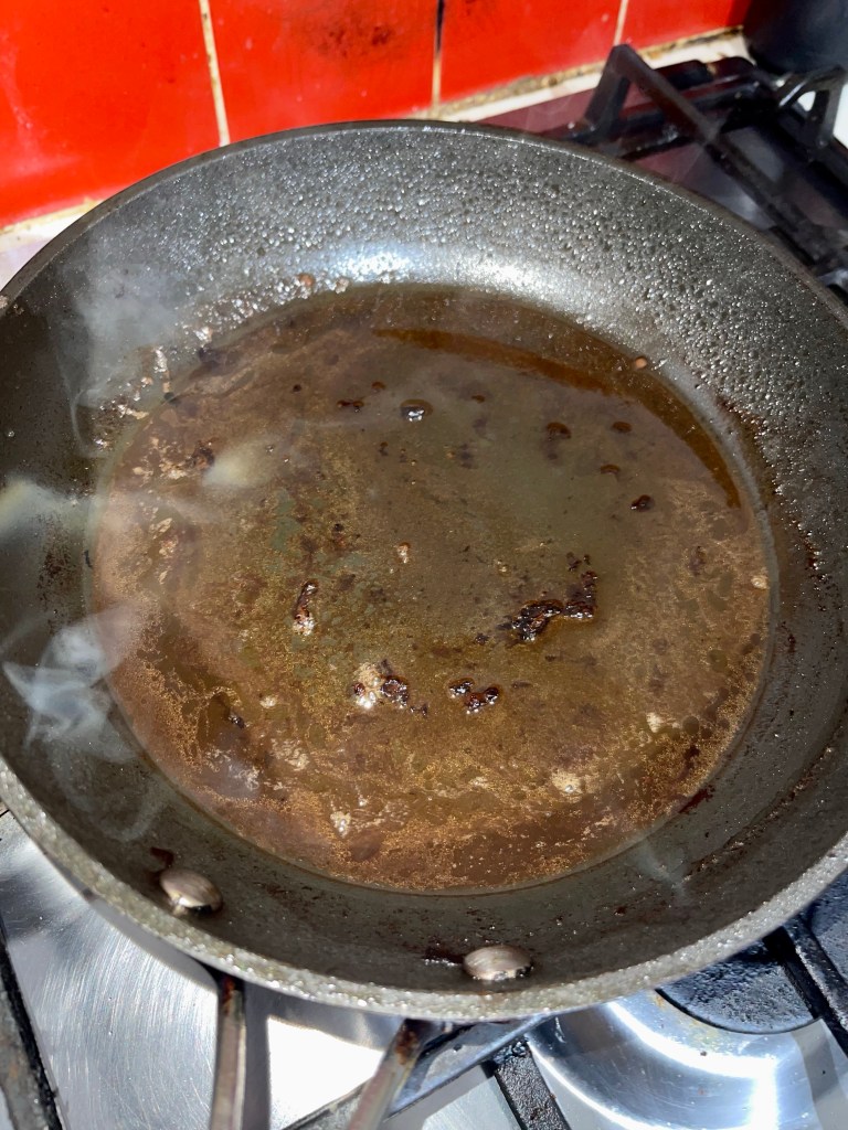 - Bring the red wine to the boil in a saucepan. Let it bubble away for a couple of minutes to burn the alcohol off. Add the stock and reduce the liquid by half.