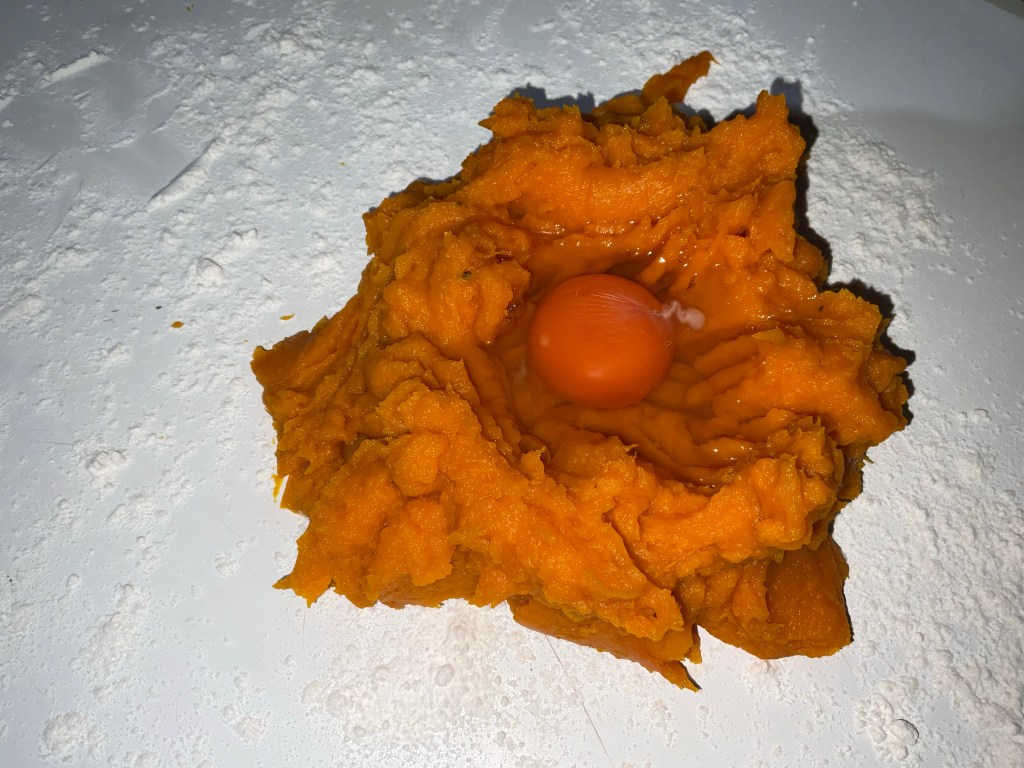- Tip the squash onto a floured surface. Make a well in the middle and crack open the egg into it. Mix the egg thoroughly into the squash mixture.