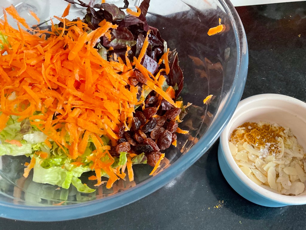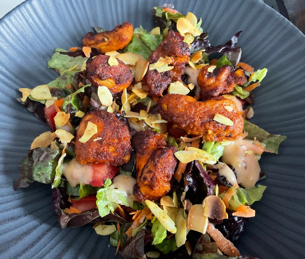 I love tandoori chicken and poppadoms with the yummy chutneys, the mango is my favourite. So to get an Indian hit I thought I would turn it into a salad. Rather doing a whole leg of chicken, I changed it to chunks. For the poppadom element I used flaked almonds and finally for the mango chutney I made the creamy dressing. I could of eaten both bowls of this (made my hubby one too) but sadly I couldn’t but I can’t wait to have it again.