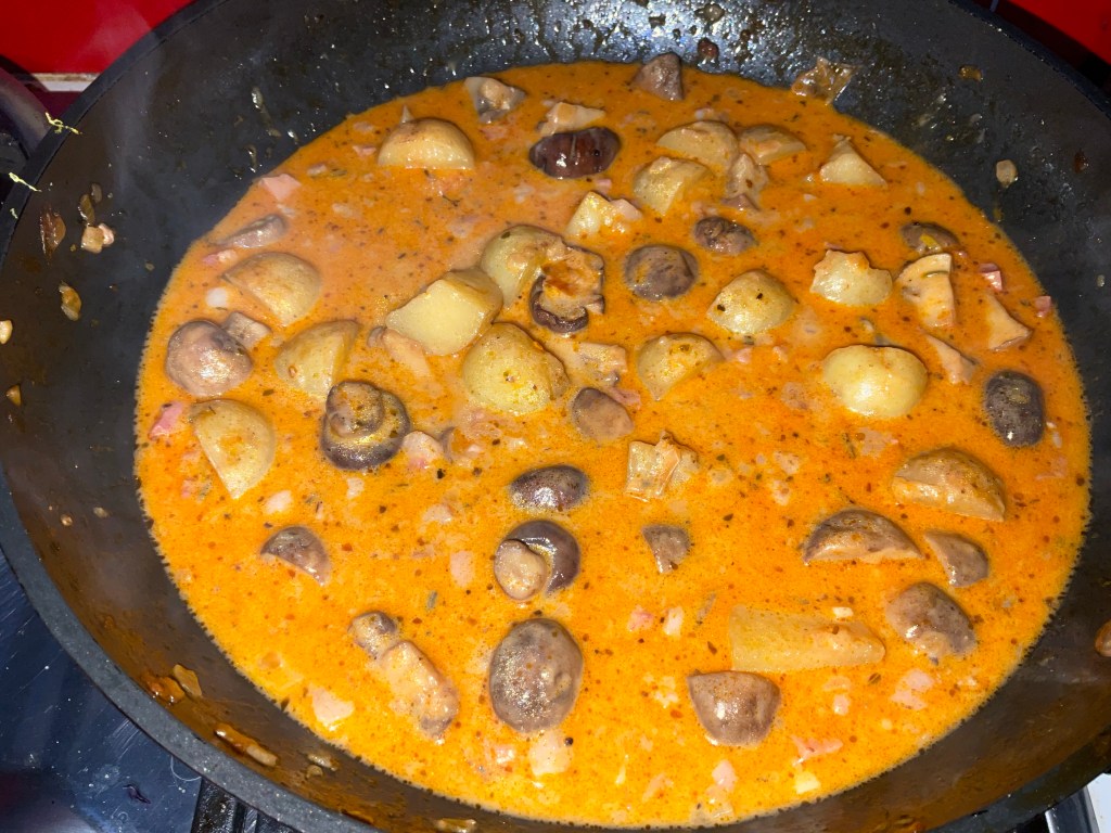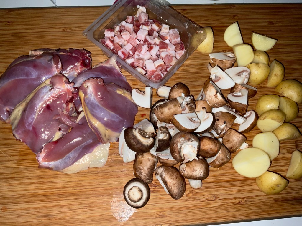 - Now add the potatoes and mushrooms (add more butter if you need too) fry for 4-5 minutes. Again set aside with the pancetta and thighs.