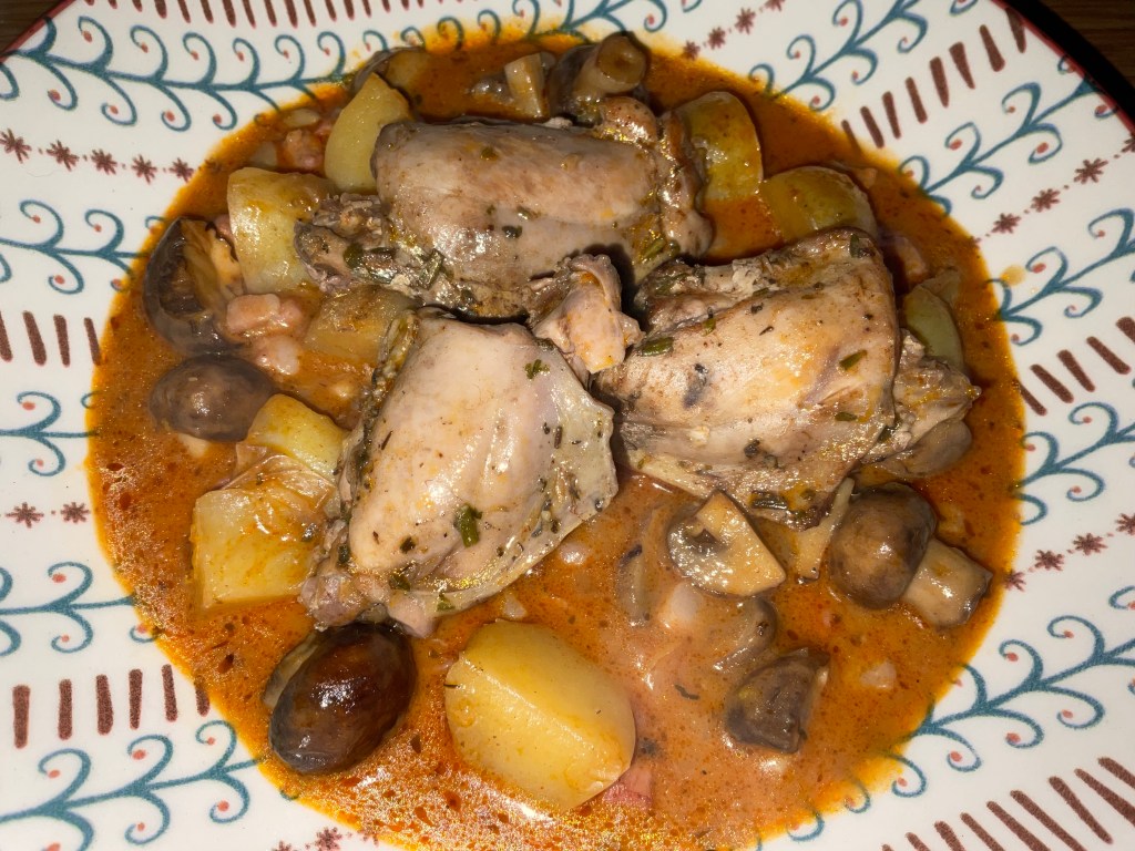 - Return the pancetta, potatoes and mushrooms back to the pan. Sprinkle in the tsp of herbs. Nestle in the thighs. Bring to the boil then reduce to a low simmer. Out the lid on and simmer for 15 minutes stirring occasionally.