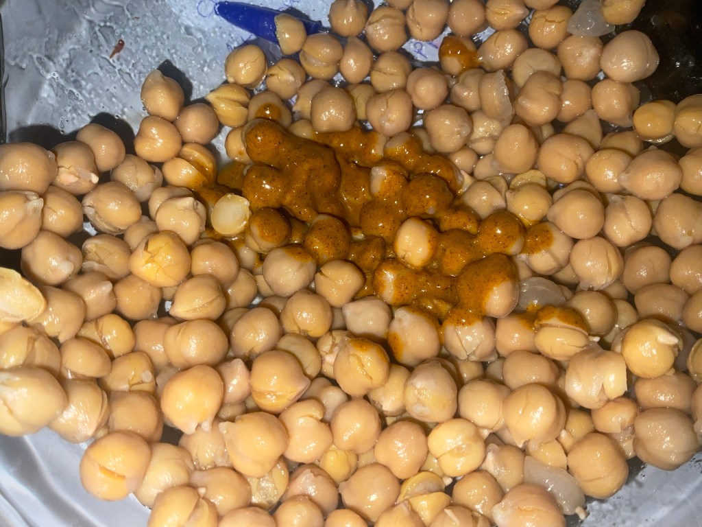 - Put the chickpeas in a bowl, pour over the dressing and give it a toss so all of the chickpeas are coated.