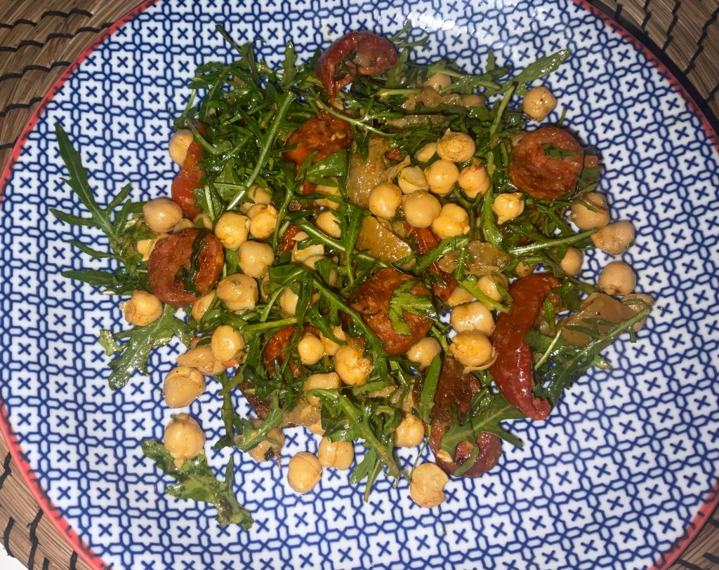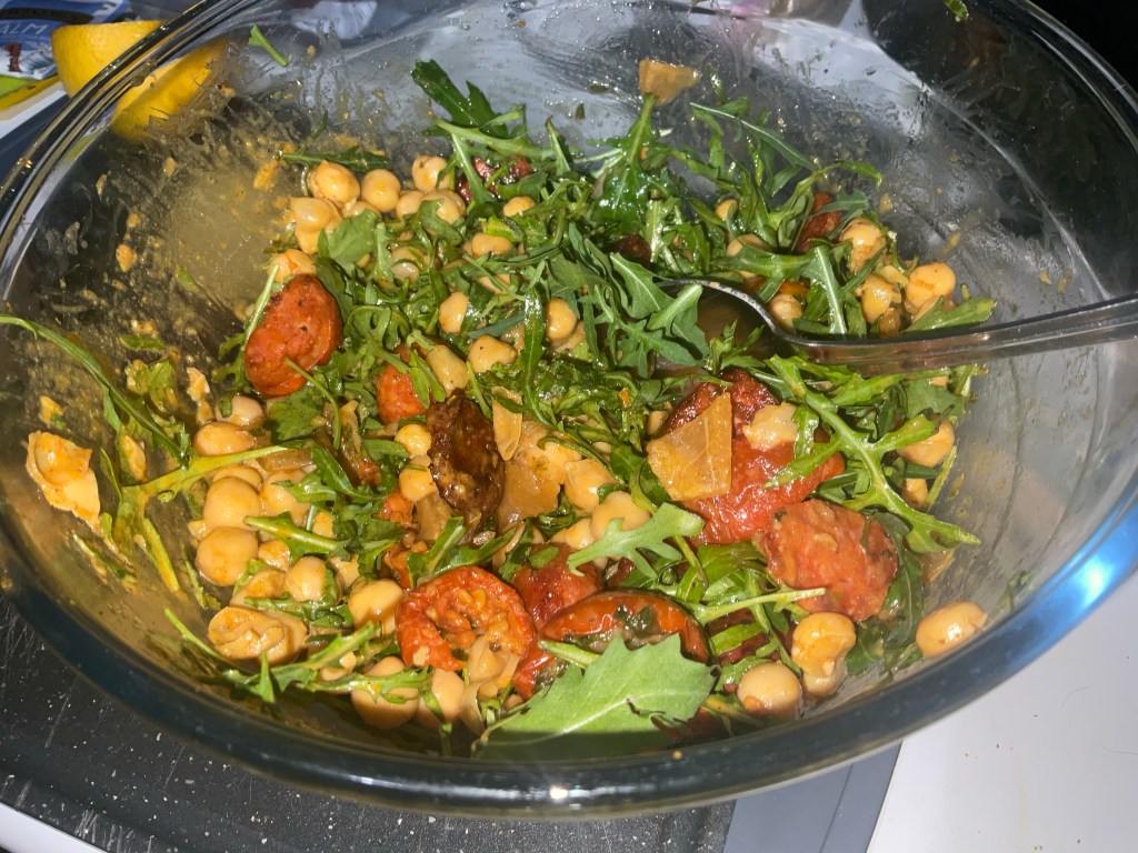 - Add the rest of the salad to the chickpeas and fold through. Serve and enjoy 😊