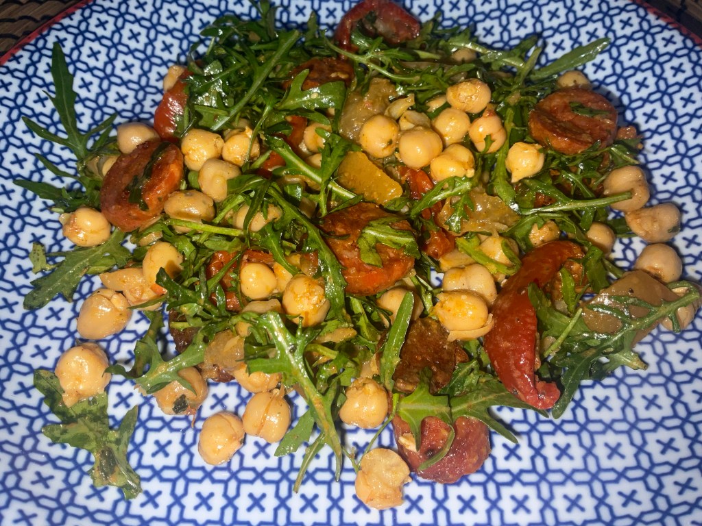 I had some ras el hanout in the back of the cupboard and thought I better use it for something. As it’s Middle Eastern chickpeas came to mind and I thought I’d do a tasty salad. This salad was amazing! The spicy chorizo, warming spices and zingy preserved lemon. I am also addicted to semi dried tomatoes at the moment as they are so sweet. I could eat a pot on my own.