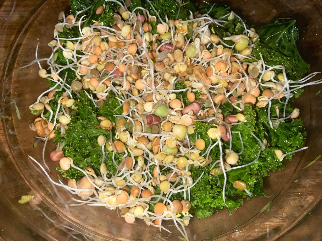 - Add the sprouted beans to the kale and give it a toss to combine.