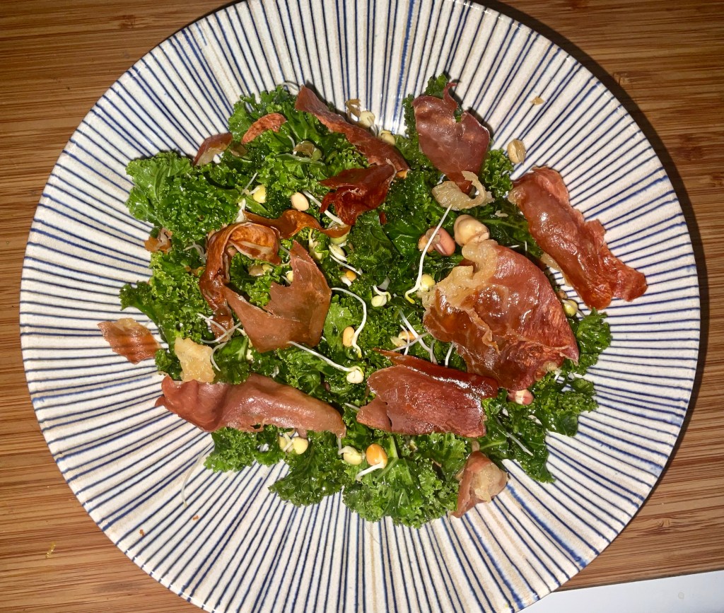 - Add the kale mixture between 2 serving bowls. Top with the crispy parma ham. Enjoy 😊