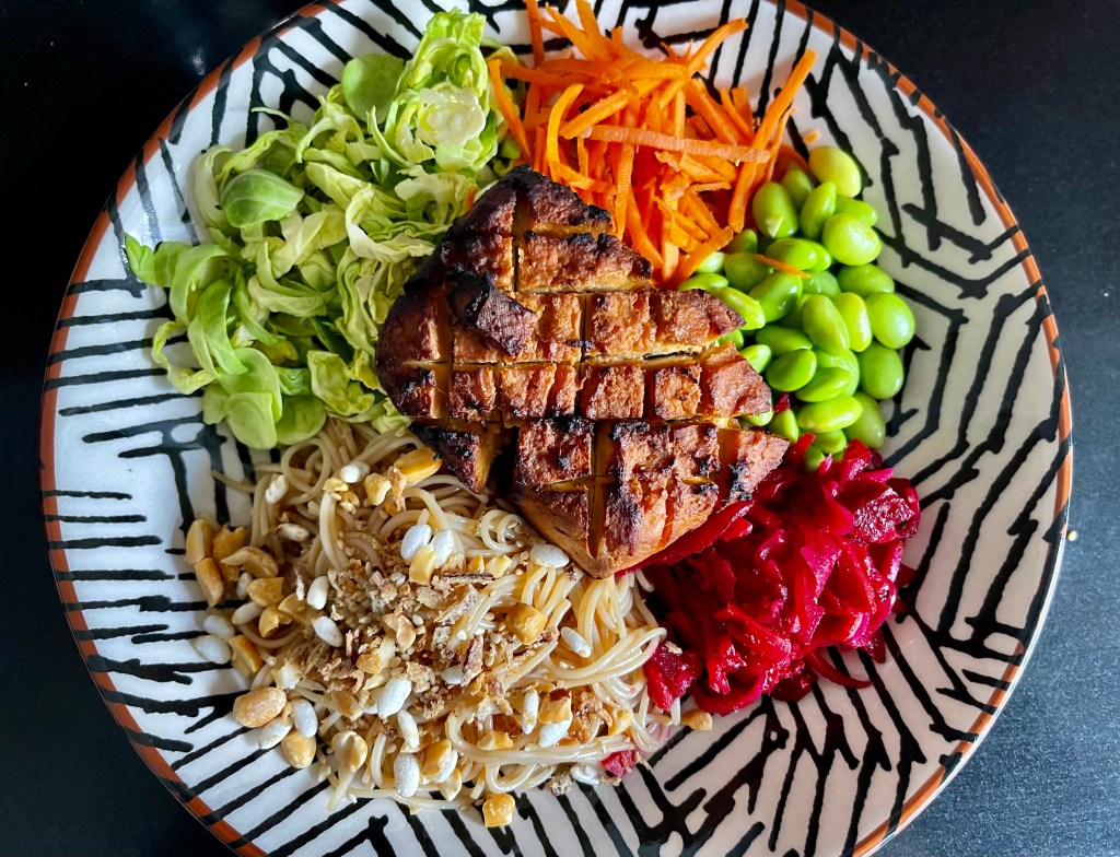 - Finish off by adding the tofu to the bowl, give it a brush with the reserved marinade and sprinkle over topping. 😊