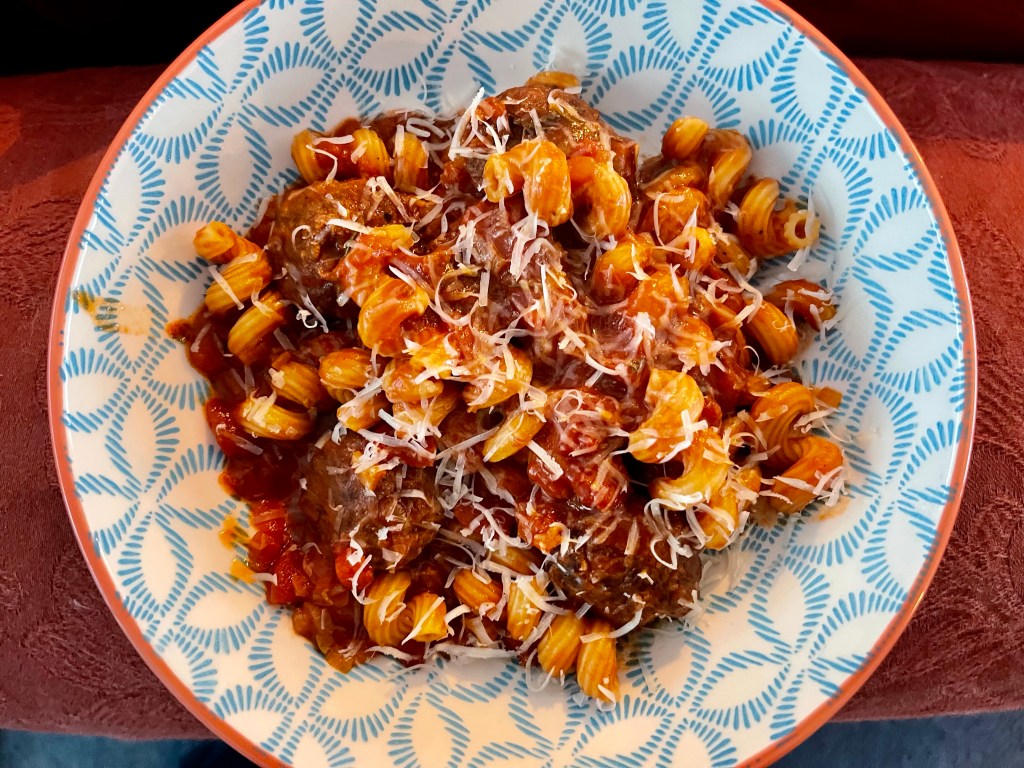 - Add the pasta and cooked meatballs. Pop in the oven for 20 minutes.