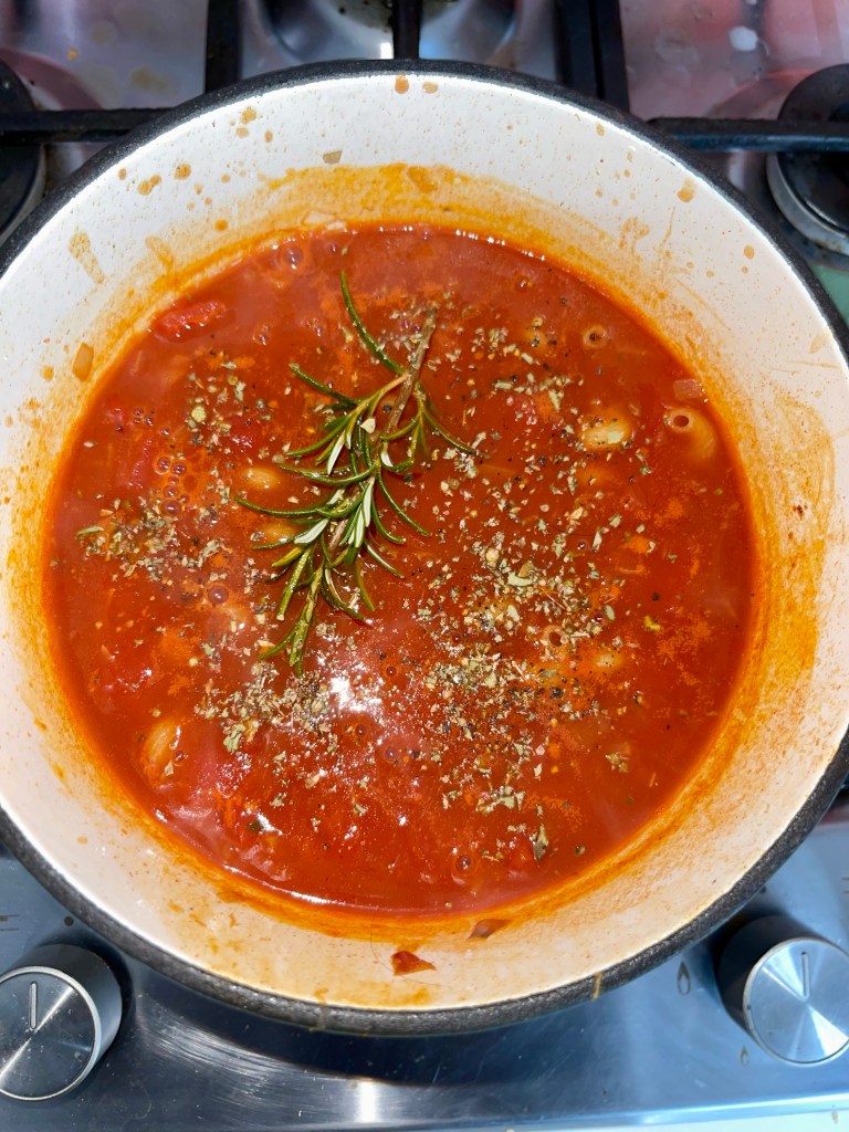 - Add the tinned tomatoes and chicken stock. Bring to the boil then turn off the heat.